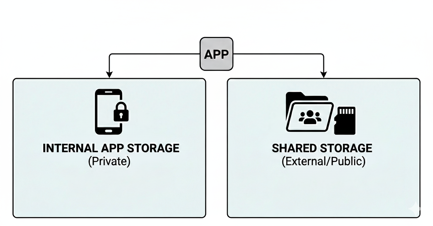 Android separates storage into app-specific (private to the app) and shared storage (visible to other apps). The terms private and shared are not only about encapsulation; they also relate to where files live in the device’s storage volume.
